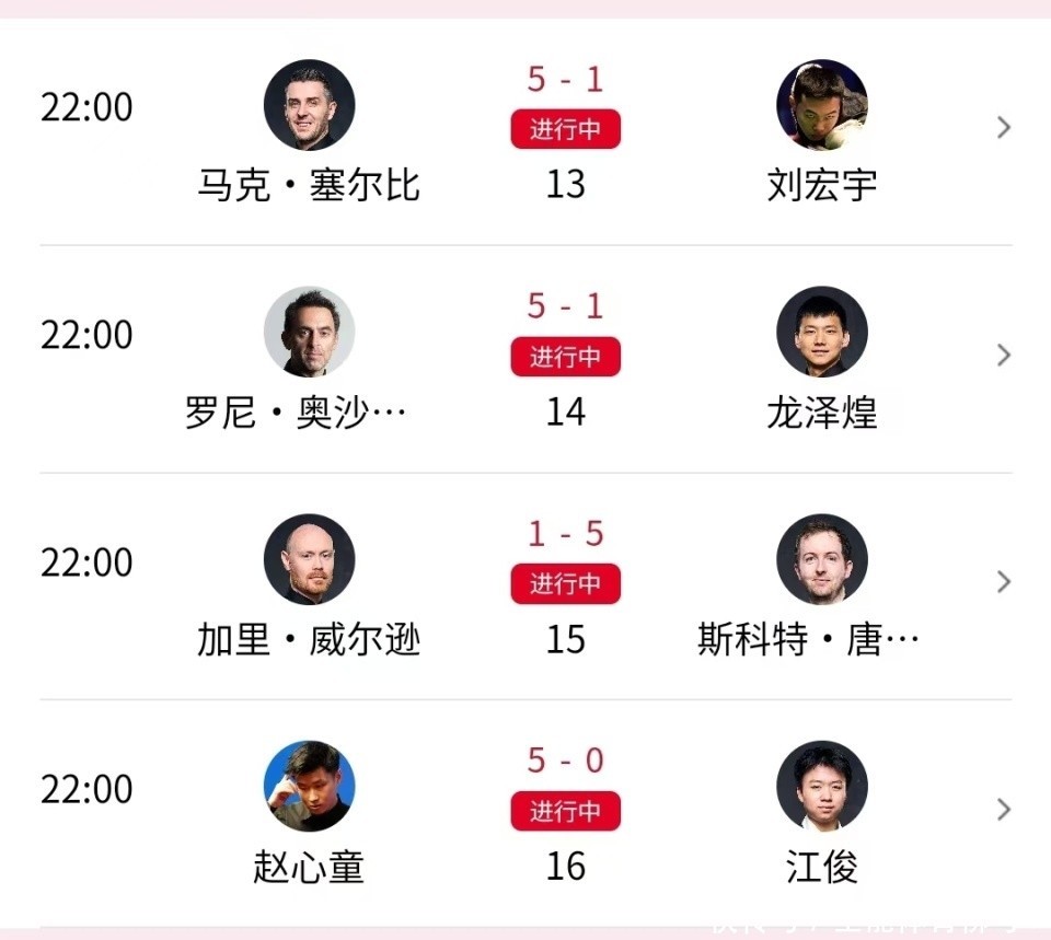 另外三场比赛,4届世锦赛冠军“巫师”约翰-希金斯以5-1轻取杰米-琼斯、4届世锦赛冠军“磨王”马克-塞尔比以5-1淘汰刘宏宇、名次赛三冠王加里-威尔逊以1-5不敌斯科特-唐纳森。