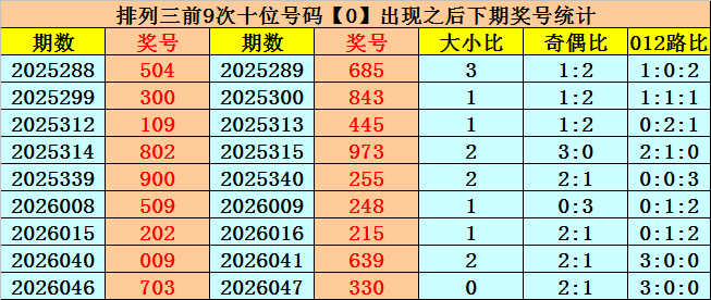 十位号码:十位上期开非凡数、大号、0路号码:0,历史上十位号码0共开出730期,上一次出现时第2026046期,上期奖号遗漏值为12期。
