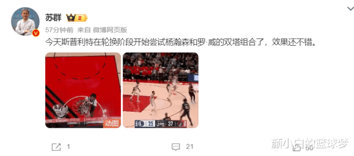 苏群夸了一下斯普利特,在交替阶段给了杨瀚森与罗威搭档双塔的契机,成果还可以。