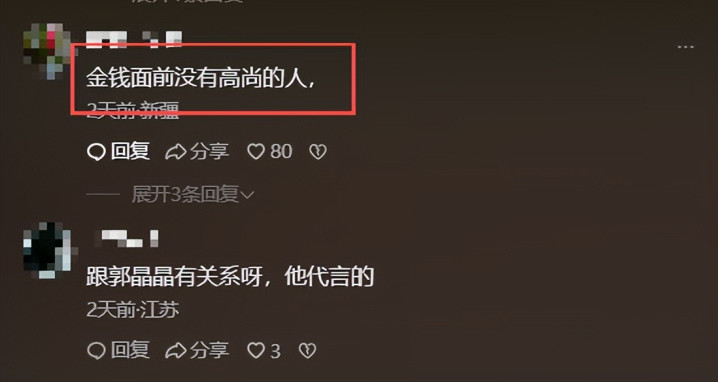 “郭晶晶真不应该再去作念什么告白、代言,缺那点钱吗?一朝出现问题,个东说念主形象、家眷形象皆随着受负担,实在是焉知非福!”