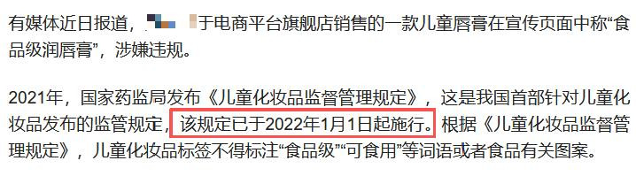 据悉,该唇膏品牌近日在宣传案牍中,声称某款儿童唇膏为“食等第唇膏”。
