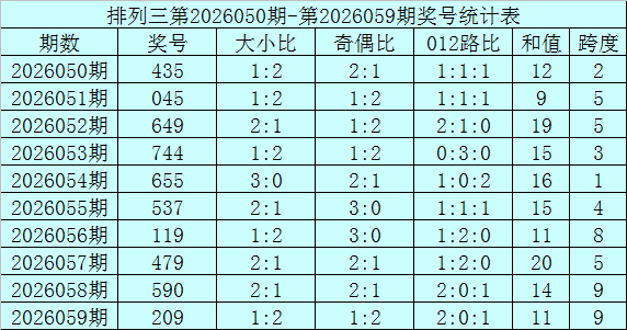 上期追思:摆设三第2026059期奖号为209体育集锦,奖号012路比为2:0:1,奇偶比为1:2,大小比为1:2,和值为11,跨度为9。