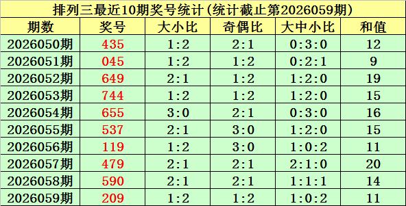 上期讲究:摆列三第2026059期奖号为:209。奖号类型:组六,和值:11,奇偶比:1:2,跨度:9,大小比:1:2。