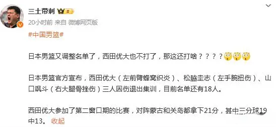 阐明媒体东谈主三土带刺发文:日本男篮官方布告,西田优大(左前臂蜂窝织炎)、松脇圭志(左手腕扭伤)、山口飒斗(右大腿骨损伤)三东谈主因伤退出集训,现时名单还有18东谈主。