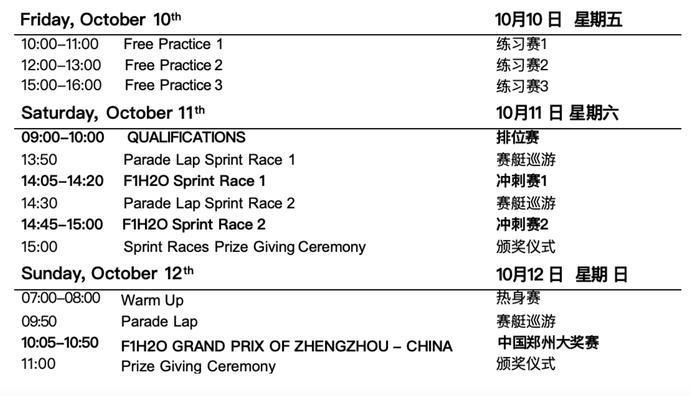 10月12日,7:00-8:00举行热身赛,9:50举行赛艇巡游,10:05-10:50举行中国郑州大奖赛,11:00举行授奖庆典。