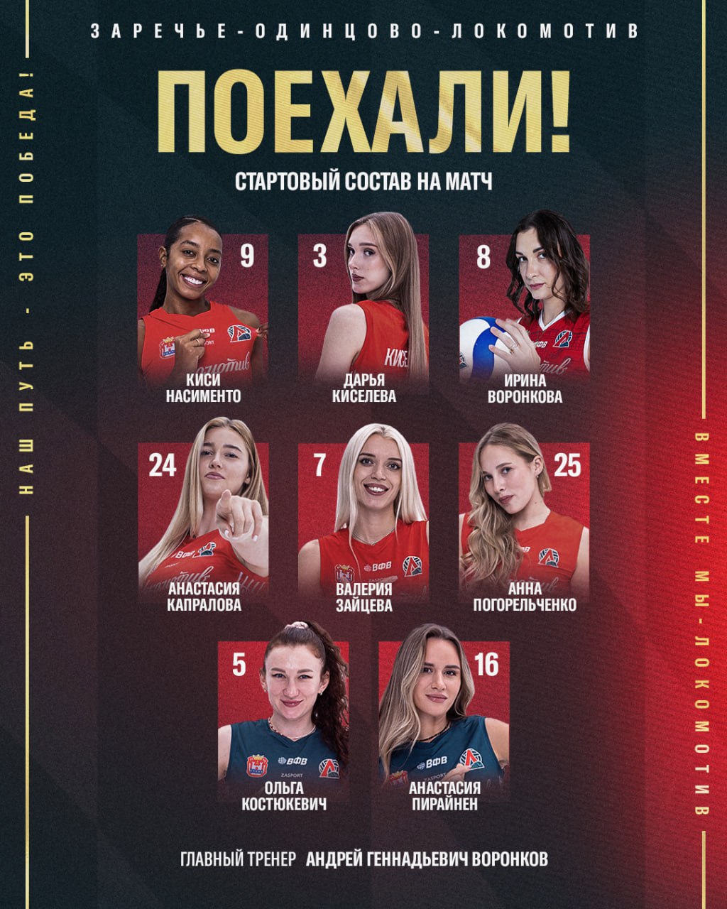 本场比赛,火车头女排派出的首发气势包括了:主攻伊琳娜·沃龙科娃+阿纳斯塔西娅·卡普拉洛娃,副攻达里娅·基谢列娃、瓦列里娅·扎伊采娃,策应基西·纳西门托,二传安娜·波戈列任科,以及双目田人奥尔加·科斯秋凯维奇+阿纳斯塔西娅·皮莱宁。