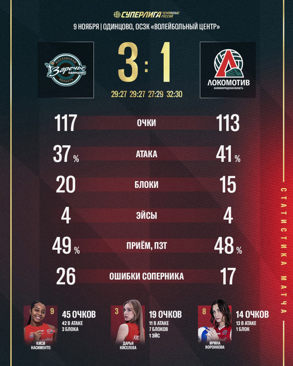 北京期间11月10日,俄罗斯女排超等联赛演出一场热烈对决,加里宁格勒火车头客场挑战扎列奇耶-奥金佐沃体育录像/图片,最终以1比3惜败敌手(27-29、27-29、29-27、30-32),无缘逆转。