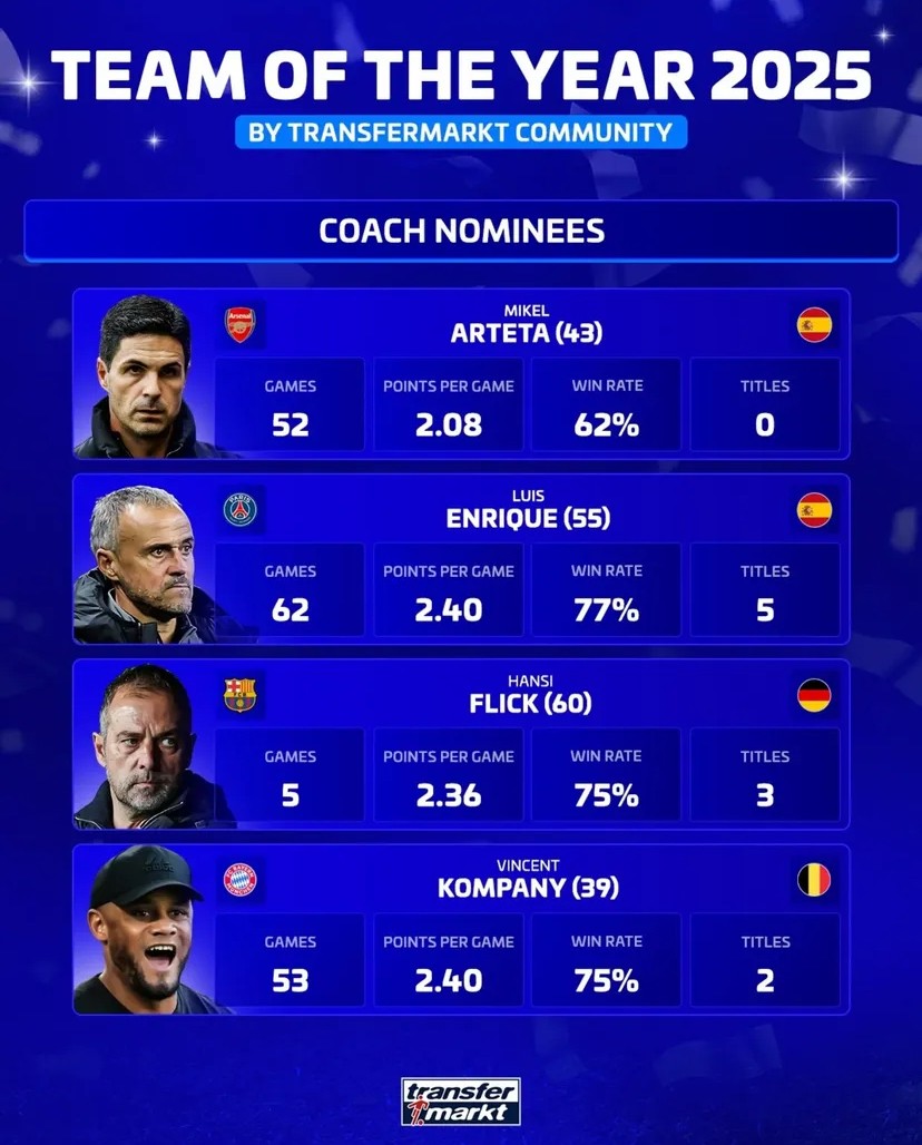 德转2025年度最好主帅候选:阿尔特塔(43岁) 阿森纳2025年抓教收获:52战场均2.08分 胜率62% 0冠恩里克(55岁) 巴黎圣日耳曼2025年抓教收获:62战场均2.40分 胜率77% 5冠弗里克(60岁) 巴塞罗那2025年抓教收获:55战场均2.36分 胜率75% 3冠孔帕尼(39岁) 拜仁慕尼黑2025年抓教收获:53战场均2.40分 胜率75% 2冠体育录像/图片