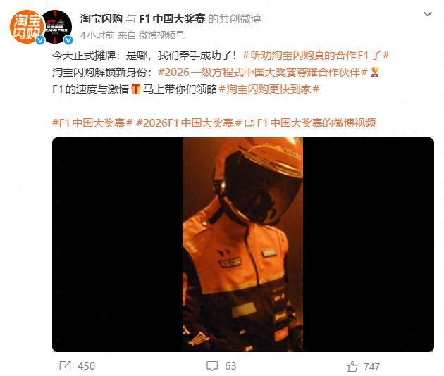 3月9日讯息,淘宝闪购追究官宣与久事体育终端政策伙同体育录像/图片,成为 2026 F1 中国大奖赛尊耀勾联合伴。
