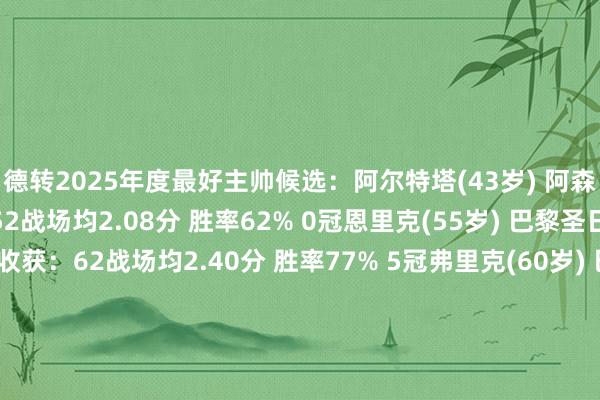 德转2025年度最好主帅候选:阿尔特塔(43岁) 阿森纳2025年抓教收获:52战场均2.08分 胜率62% 0冠恩里克(55岁) 巴黎圣日耳曼2025年抓教收获:62战场均2.40分 胜率77% 5