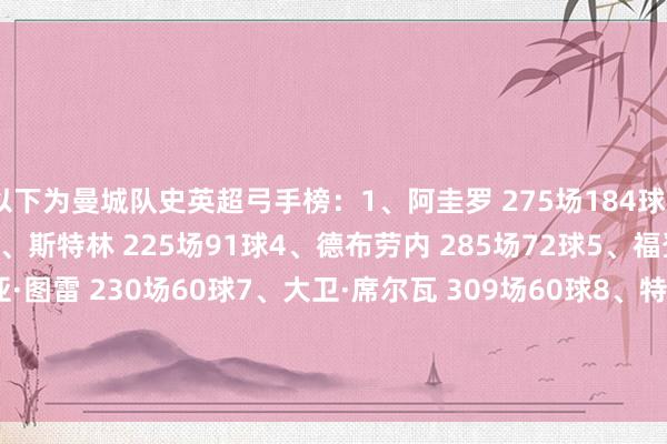 以下为曼城队史英超弓手榜:1、阿圭罗 275场184球2、哈兰德 110场99球3、斯特林 225场91球4、德布劳内 285场72球5、福登 203场64球6、亚亚·图雷 230场60球7、大卫·席