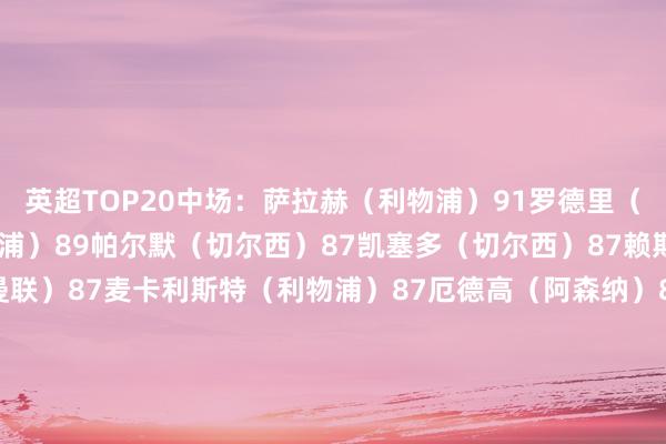 英超TOP20中场:萨拉赫(利物浦)91罗德里(曼城)90维尔茨(利物浦)89帕尔默(切尔西)87凯塞多(切尔西)87赖斯(阿森纳)87B费(曼联)87麦卡利斯特(利物浦)87厄德高(阿森纳)87吉马