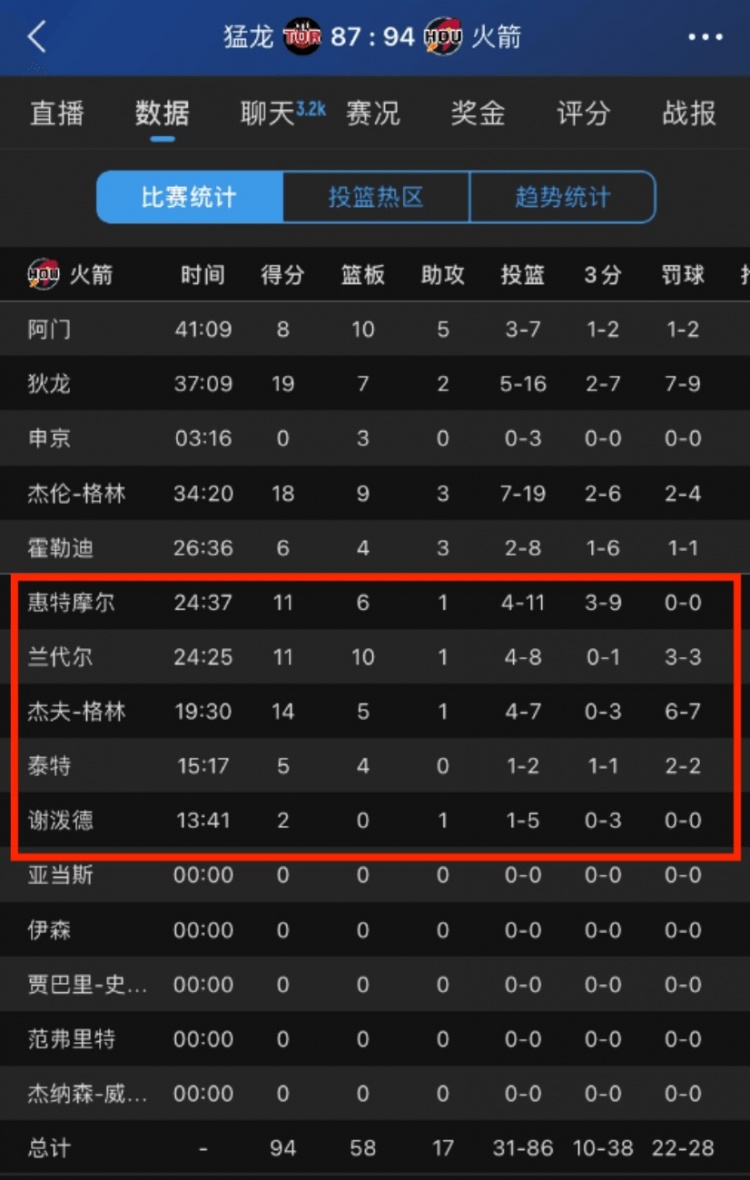 本场比赛,火箭替补球员进攻端为球队作出广漠孝敬,5东谈主轮流上场都有得分,其中3东谈主上双,合砍全队94分中的43分。