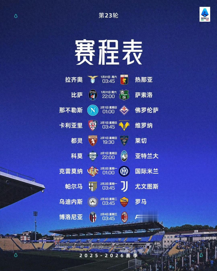 北京时辰1月31日-2月4日凌晨,意甲第23轮分5个比赛日进行10场比赛争夺。榜三的球队纷纷作客——名挨次二的AC米兰客场挑战近10轮仅1胜的博洛尼亚是为本轮焦点战,领头羊海外米兰则客场迎战升班马克雷莫纳体育赛事直播,榜三的罗马客战乌鸡。而名挨次四的那不勒斯主场迎战今是昨非、如今深陷左迁区的紫百合亦然本轮焦点战。