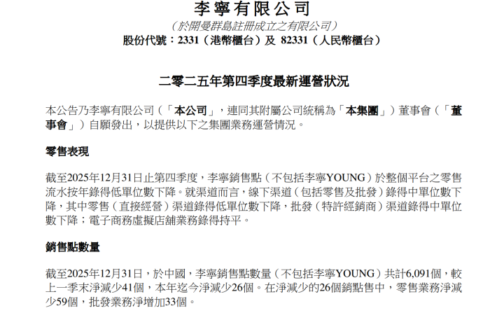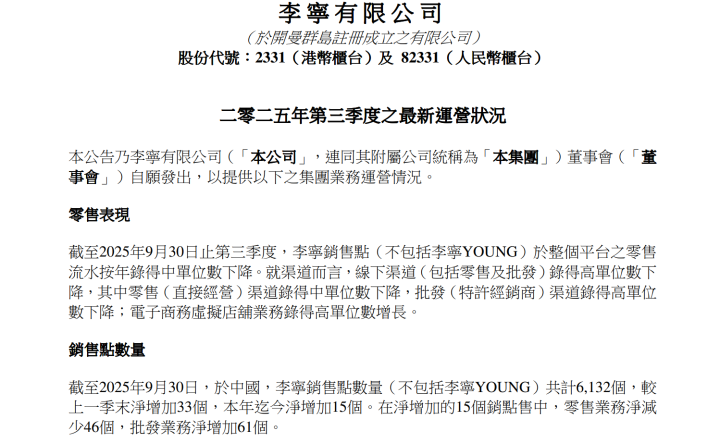 天然还未公布2025全年纪迹,但李宁公布了季度运营情况。2025年三季度,李宁销售点(不包括李宁YOUNG)于通盘这个词平台零卖活水同比出现中单元数下落。四季度照旧没能得到增长,零卖活水同比录得低单元数下落。